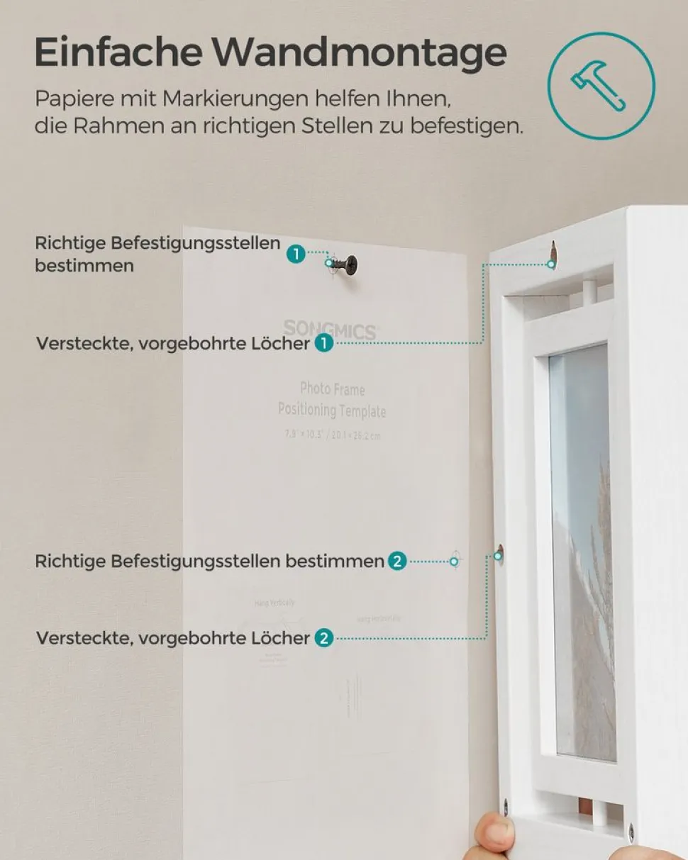 2 beiliegende Papiere mit Markierungen helfen Ihnen, die Stellen zur Befestigung der Rahmen an der Wand zu bestimmen