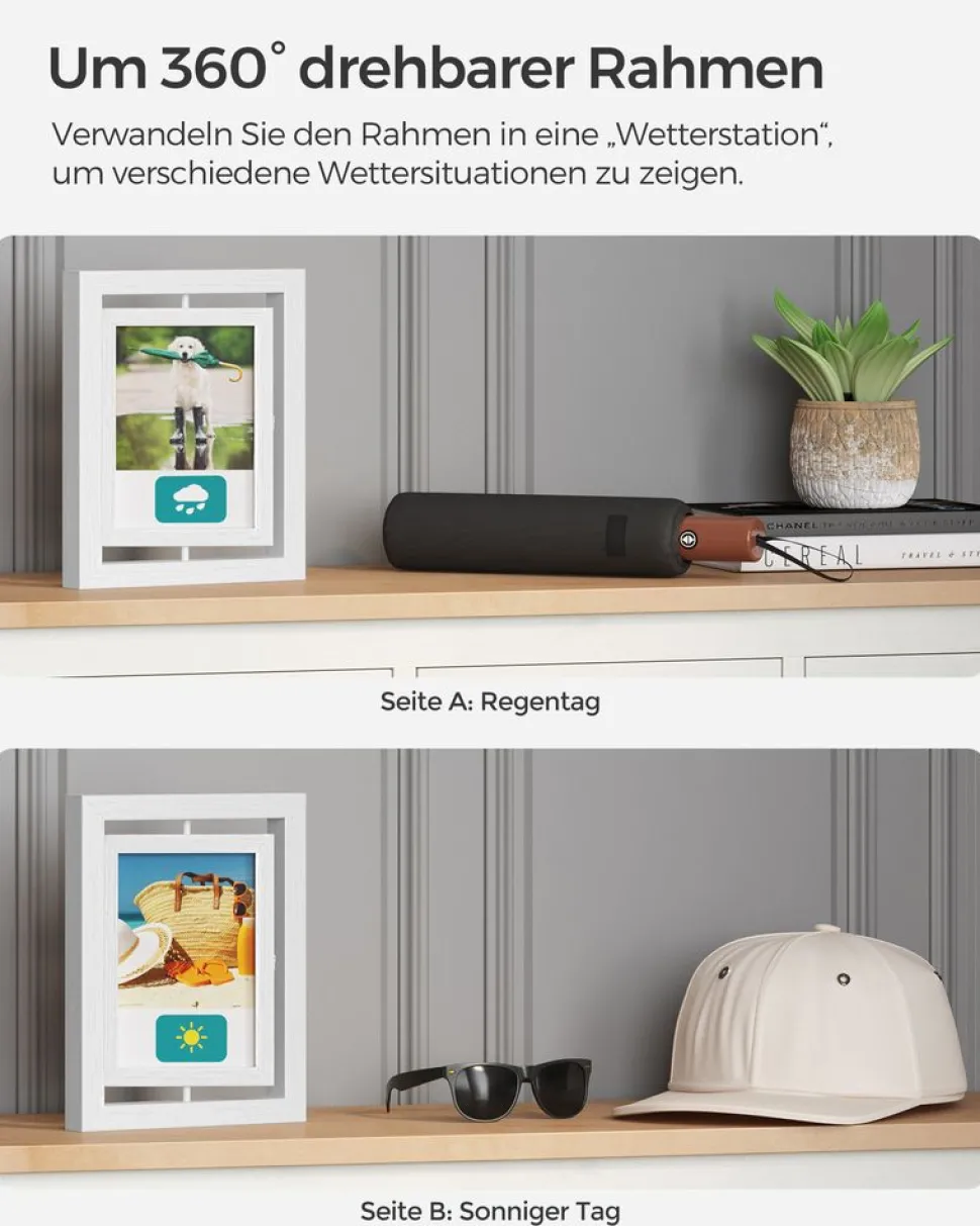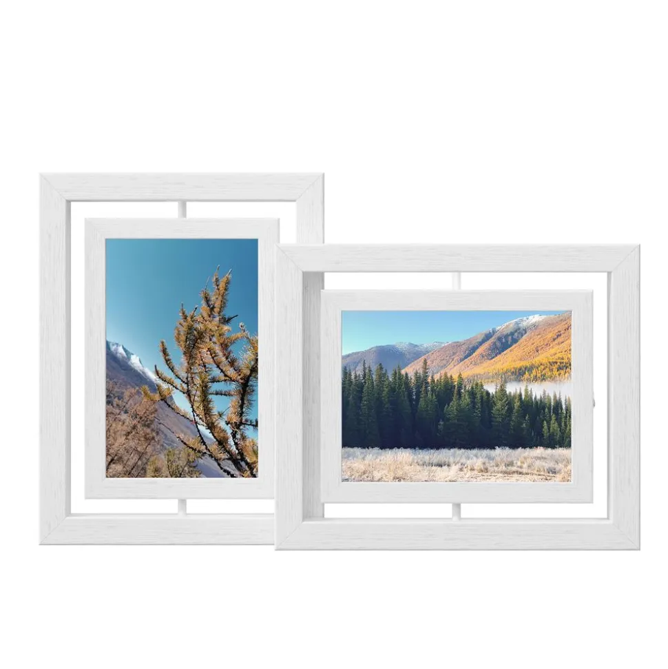 Drehen, präsentieren und schmücken: Die drehbaren Bilderrahmen hat 2 Glasscheiben, um auf jeder Seite je ein Foto präsentieren zu können. Moderner Look, weiße Oberfläche mit Maserung – die Rahmen passen zu verschiedenen Einrichtungsstilen.