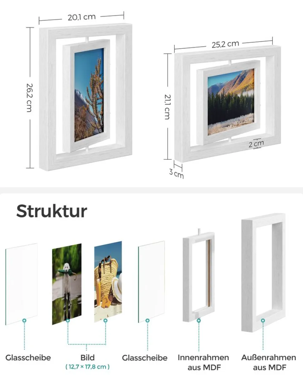 Drehen, präsentieren und schmücken: Die drehbaren Bilderrahmen hat 2 Glasscheiben, um auf jeder Seite je ein Foto prä…