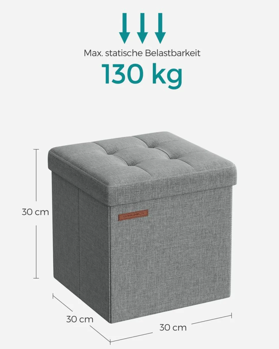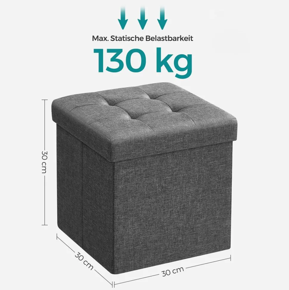 Color: Dark GreyMaterial: Imitation linen, foam, MDF (medium density fibreboard). Size: 30 x 30 x 30 cm (D x W x H). Weight: 1.5 kg. Max. Static load capacity: 130 kg