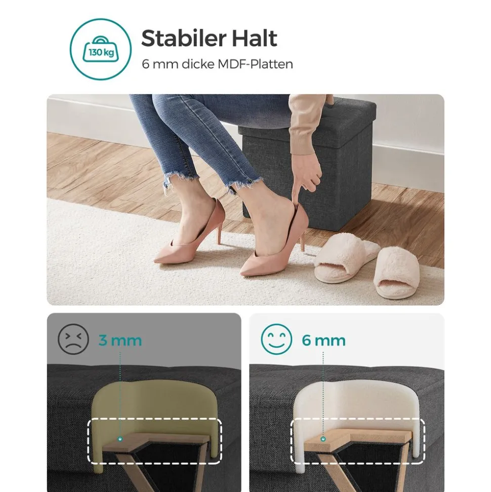 SPACE SAVING: The stool is 30 x 30 x 30 cm and takes up little space. Cosy seat pad: The seat pad made of high-density foam ensures high seating comfort. Highly resilient: The robust MDF construction can hold up to 130 kg. With storage space: Store books, clothes or other small items in this seat cube and eliminate the mess in the living room. Versatile: This storage box is suitable as a stool for putting on shoes, footstool in the bedroom or offers your cat space for a nap.