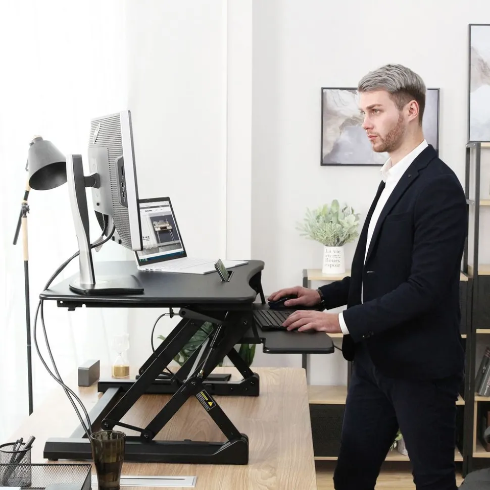 Unsere großen und breiten Stehpulte verfügen jeweils über einen hochwertigen Arbeitsbereich, der Ihren Computer und Peripheriegeräte aufnehmen kann, und Schnellverstellgriffe, so dass Sie die richtige Höhe für die richtige Ausrichtung/Position von Hand und Handgelenk finden können. -
