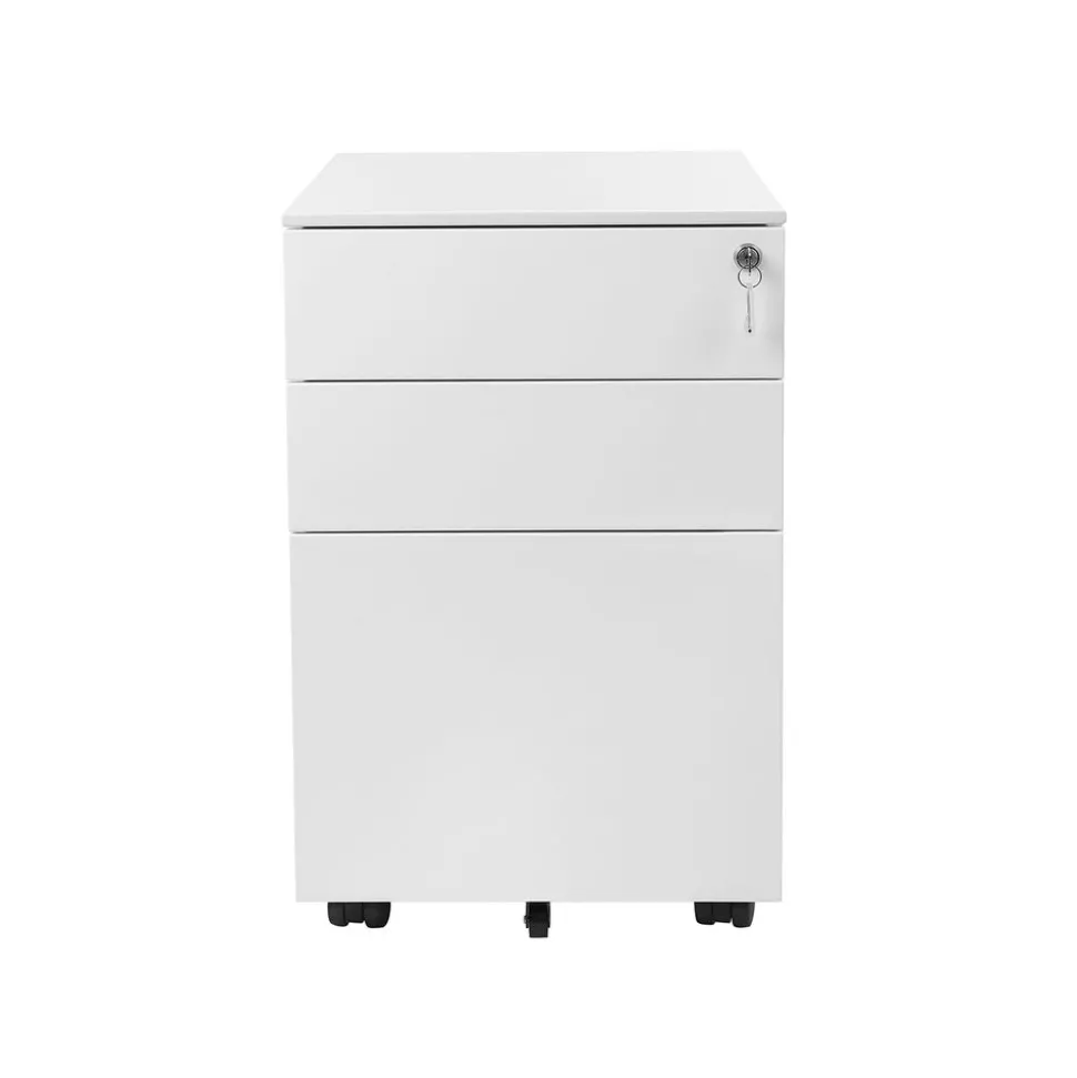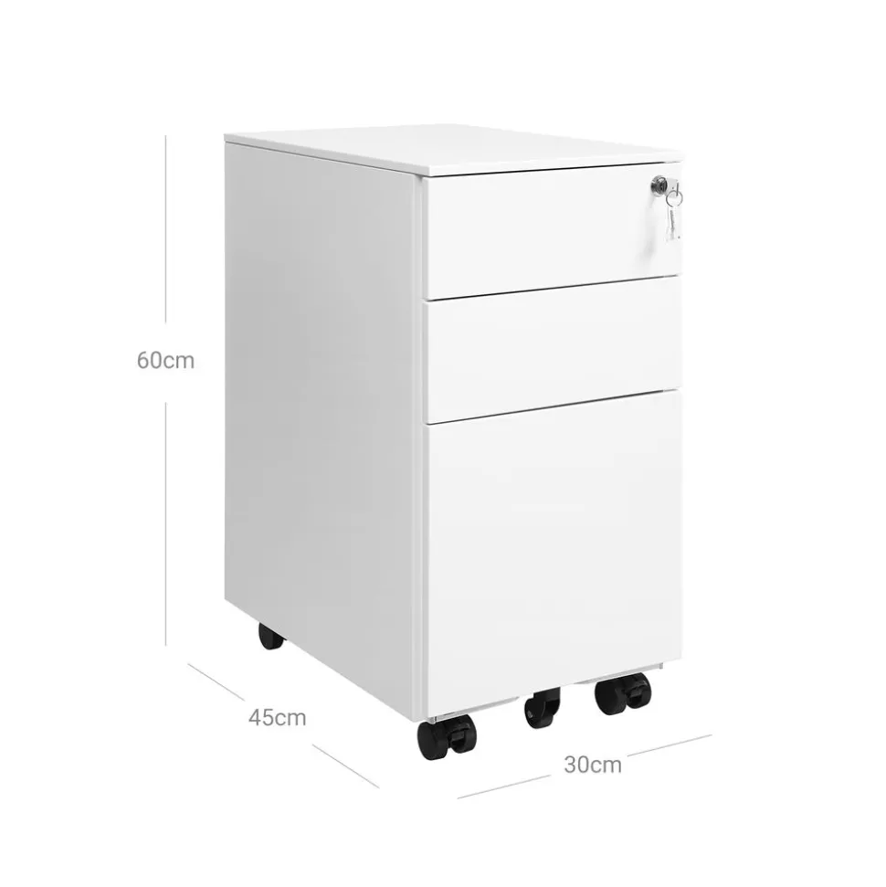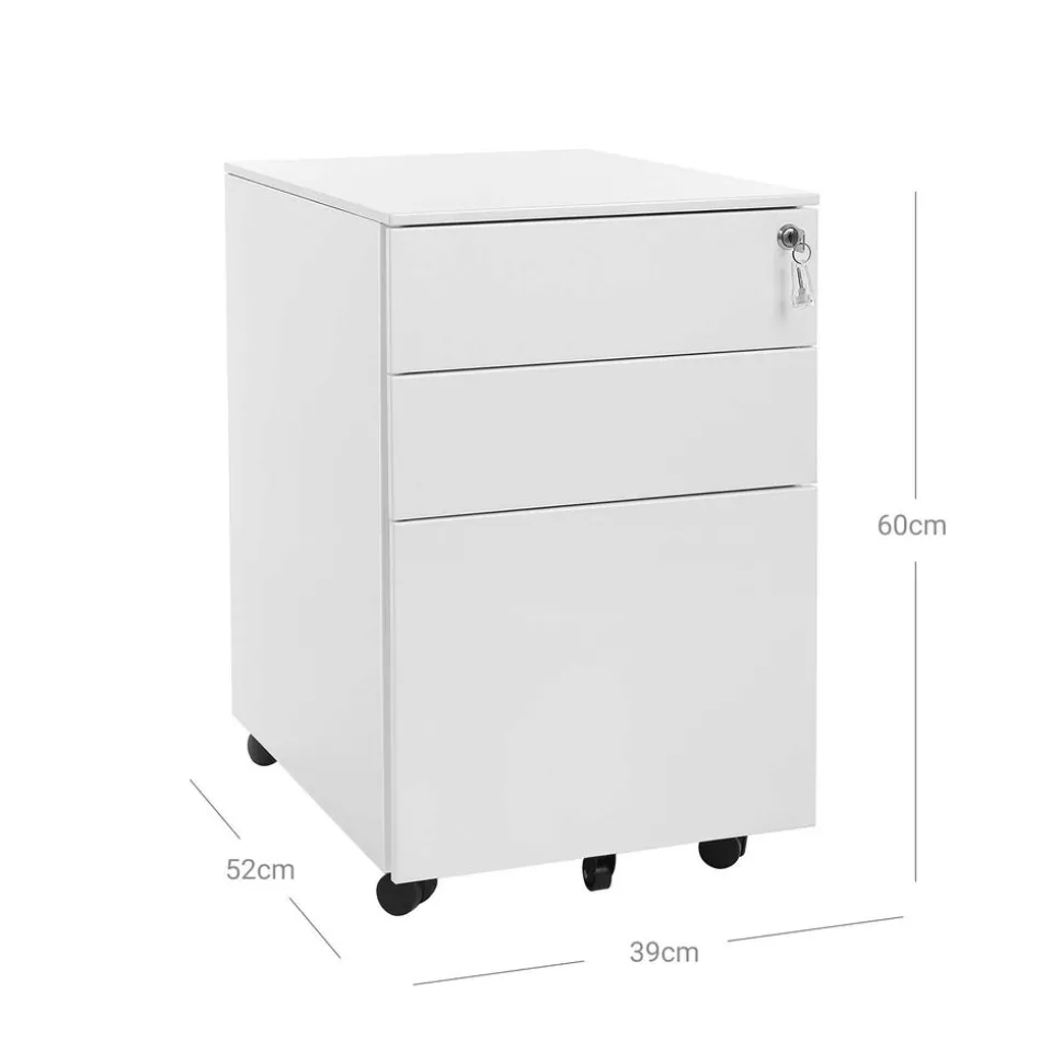 Das mit 2 Schlüsseln ausgestattete Schloss verschließt alle 3 Schubladen gleichzeitig, sodass all Ihre Dokumente sicher im Schrankcontainer verstaut sind. Mit der Höhe von 60 cm passt der Rollcontainer auch unter gängige Schreibtische und spart noch mehr Platz.SONGMICS Hinweis: