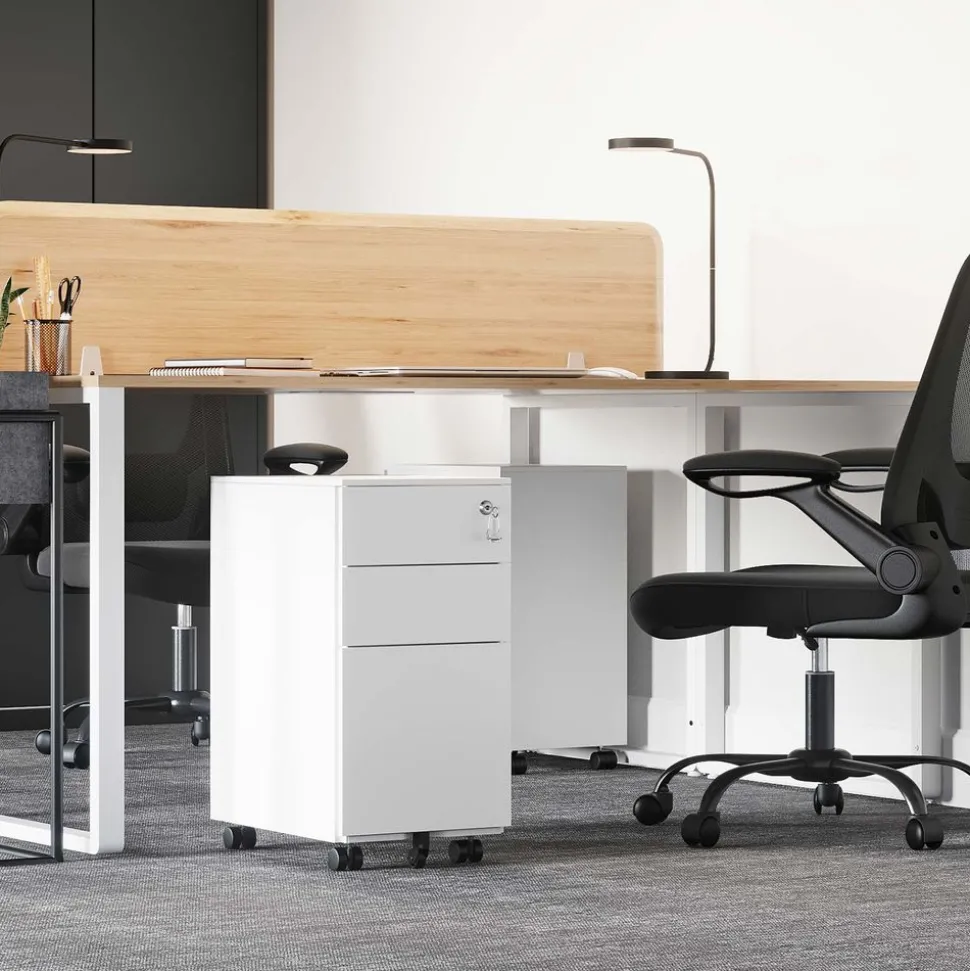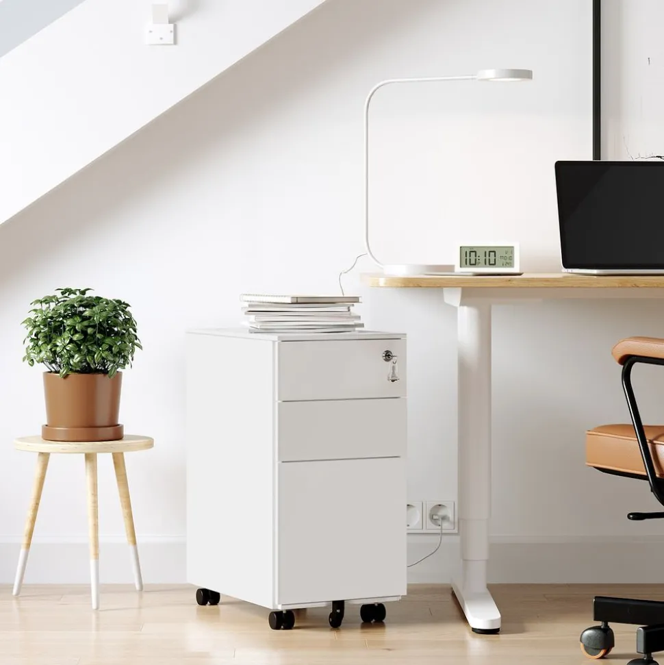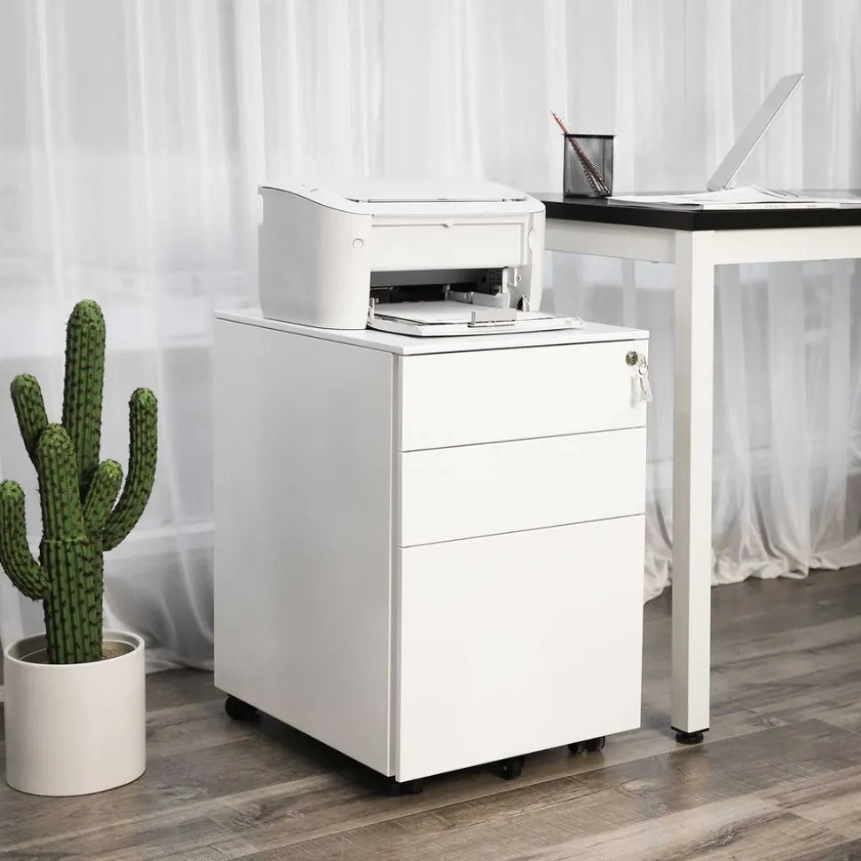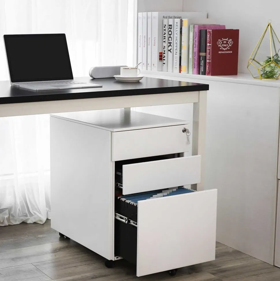 Das mit 2 Schlüsseln ausgestattete Schloss verschließt alle 3 Schubladen gleichzeitig, sodass all Ihre Dokumente sicher im Schrankcontainer verstaut sind. Mit der Höhe von 60 cm passt der Rollcontainer auch unter gängige Schreibtische und spart noch mehr Platz.SONGMICS Hinweis: