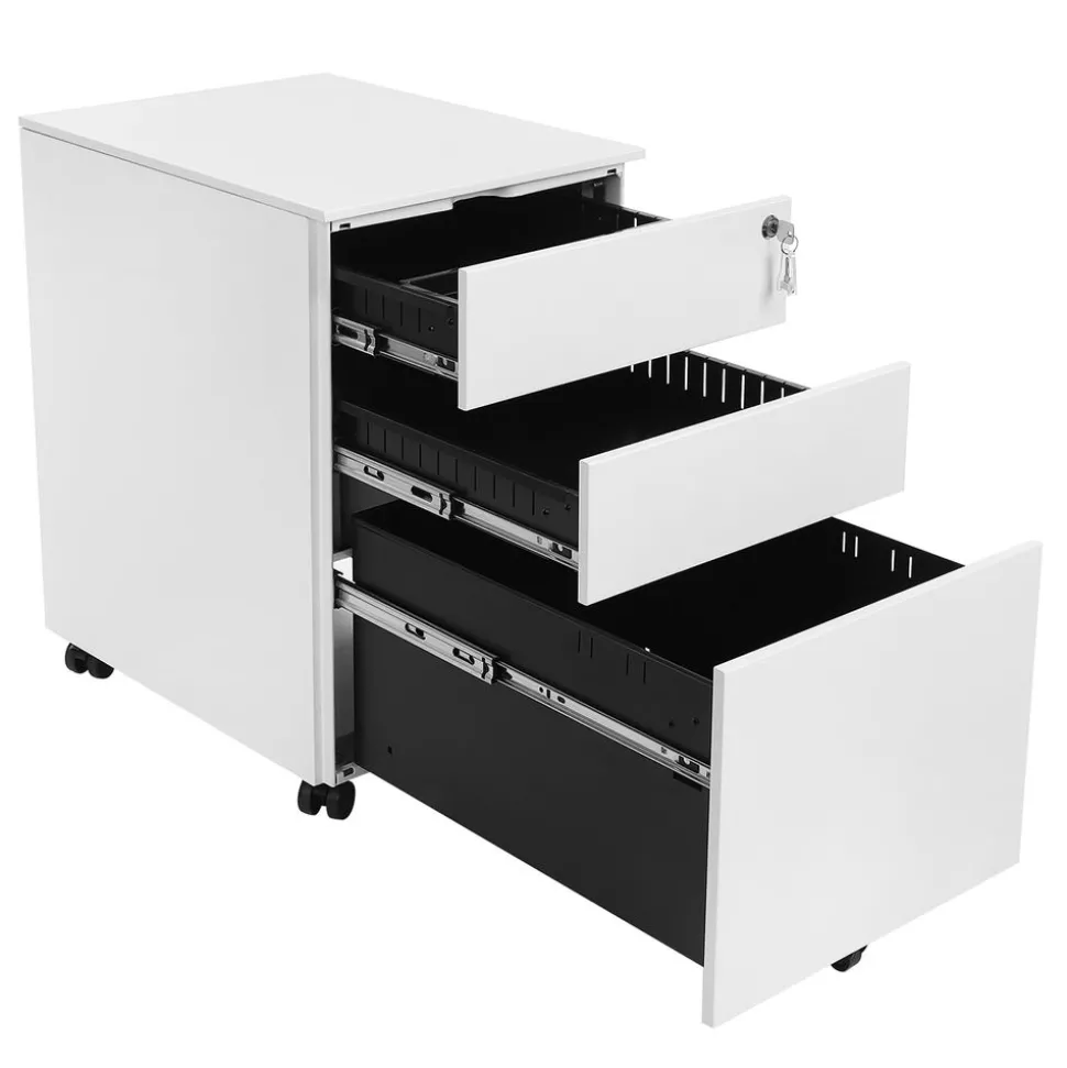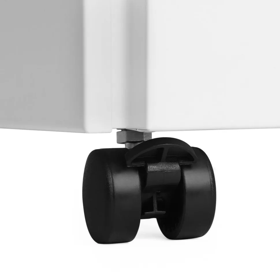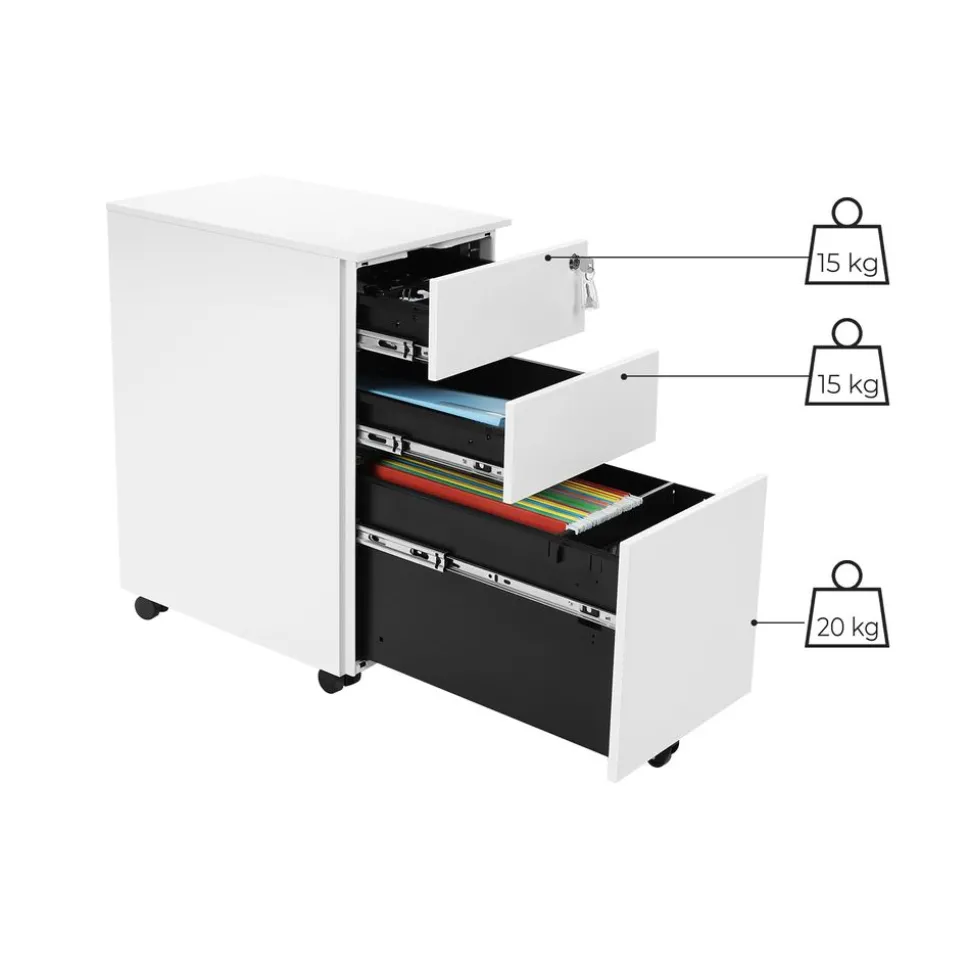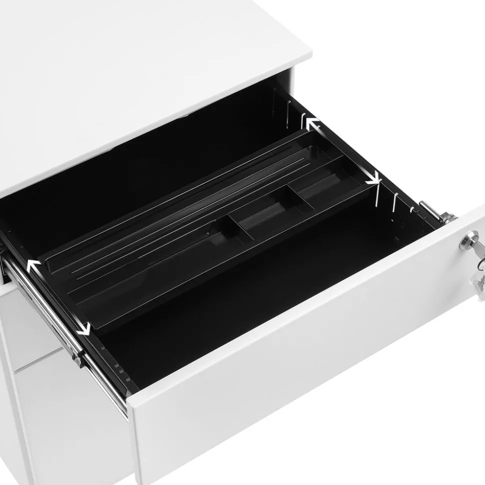 Der Rollcontainer bietet Platz für verschiedene Dokumente sowie Büromaterial. In der obersten Schublade gibt es eine zusätzliche Ablage, die für Stifte und Büromaterial genutzt werden kann. So ist alles an einem Platz. Von den 4 Rollen, die sich um 360 Grad drehen, lassen sich 2 fest arretieren, sodass der Container fest und sicher am Platz steht.Verstellbare Hängeregistratur-Schublade