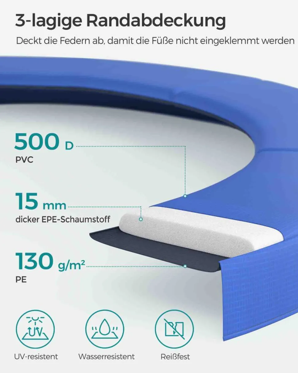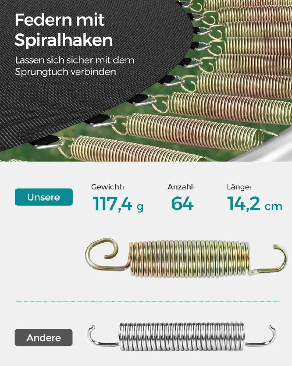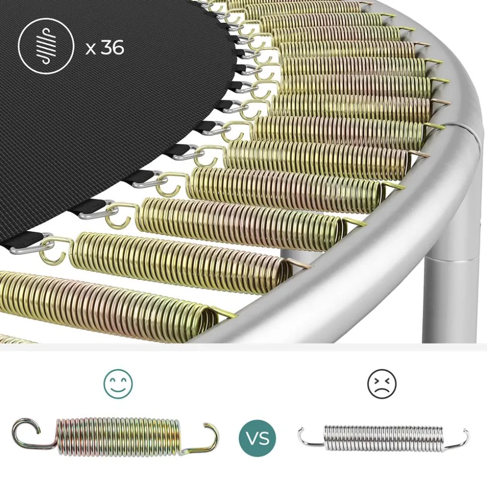 Es ist unbestritten, dass ein Trampolin ein sehr interessantes Spielzeug für Ihre Kinder ist. Das SONGMICS Trampolin zeichnet sich auf dem Trampolinmarkt durch seine hervorragende Produktqualität aus, die Kinder zum Lachen bringt und die Sicherheit beim Springen gewährleistet. Das SONGMICS Trampolin ist vom TÜV Rheinland zertifiziert (Zertifikat-Nr.:S 50396839), so können Sie sich auf die Sicherheit des Gartentrampolins verlassen. Die Langlebigkeit, Sicherheit und die hervorragende Springerfahrung des Trampolins sind unser Streben.